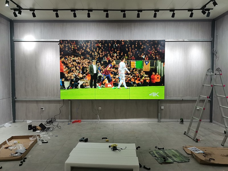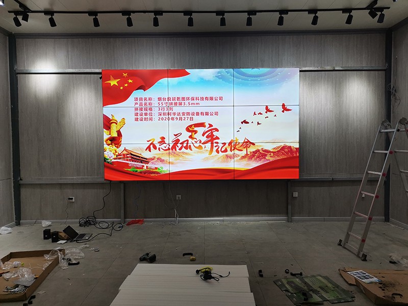 大屏幕拼接電視墻是作為各種信號(計算機(jī)、視頻、網(wǎng)絡(luò)等)的集中顯示終端,大屏幕投影顯示系統(tǒng)一定要具備高分辨率顯示、色彩均勻穩(wěn)定,并且能與各種信號良好兼容的特性。它通過快速獲取各種動態(tài)圖像信號,為領(lǐng)導(dǎo)決策和指揮提供輔助作用。深圳柯華達(dá)為煙臺環(huán)保科技有限公司項目采用55寸 3行3列 3.5mm拼縫的液晶拼接屏,漢思處理器、壁掛支架交付使用。