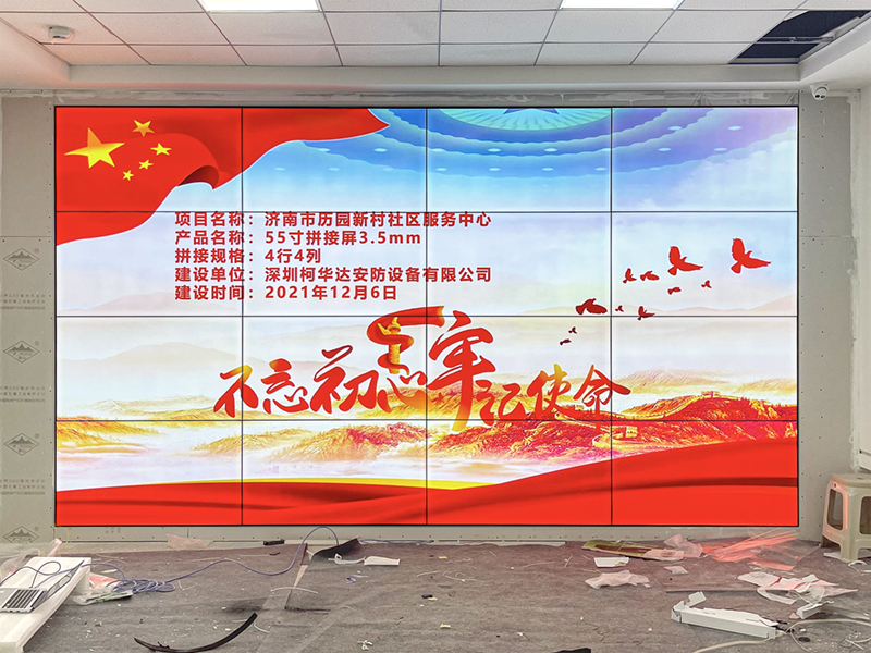 開(kāi)會(huì)中通過(guò)拼接大屏顯示系統(tǒng)進(jìn)行工作報(bào)告,可以實(shí)現(xiàn)圖、文、聲音、影像靈活展現(xiàn),充分調(diào)動(dòng)與會(huì)人員感官知覺(jué)的積極性,大大提高了會(huì)的效果。另外視頻會(huì)議的應(yīng)用讓越來(lái)越多的人開(kāi)始接受網(wǎng)絡(luò)視頻通信的方式取代面對(duì)面的交流。深圳柯華達(dá)針對(duì)濟(jì)南市歷園新村社區(qū)服務(wù)中心的項(xiàng)目要求采用了55寸3.5mm4*4拼縫,由處理器、電視墻機(jī)柜交付使用。