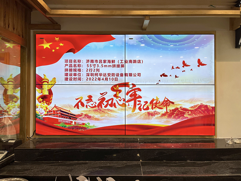柯華達(dá)品牌力助呂家海鮮 (工業(yè)南路),采購55寸液晶拼接屏2×2,漢思解碼器,高清動(dòng)態(tài)畫質(zhì),多功能展廳、視頻會(huì)議、安防監(jiān)控、大數(shù)據(jù)中心,完美演繹智能化顯示終端。