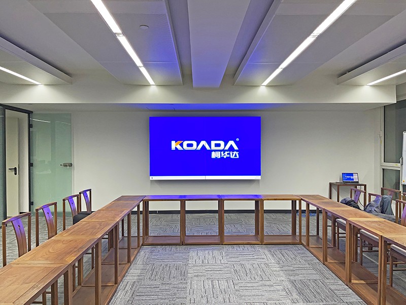 在中小型會議室中,容納的人數(shù)基本在50人以下,考慮到觀看距離較近,所以使用液晶拼接屏的較多。因液晶拼接屏的最大優(yōu)勢就是高分辨率,所以它展現(xiàn)出來的畫面非常清晰,相當(dāng)于一個擴大版的電視,而且可以清晰地展示4K視頻、高清圖片等。液晶拼接屏的色彩豐富,可以最大程度地展示出源文件的色彩。在亮度的控制上,液晶拼接屏及時在長時間觀看的情況下也不會刺眼。就以上兩點來說,毫無疑問液晶拼接屏是最適合會議辦公使用的。深圳柯華達針對青島大榮中心會議室的項目要求,制定了55寸 1.7mm 2*2的液晶拼接組合,由漢思處理器、液壓支架交付使用。