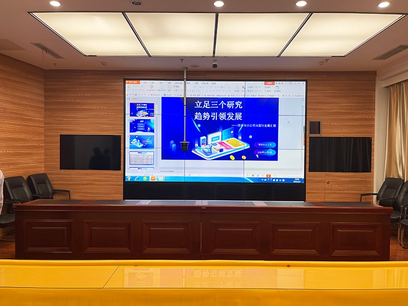 開(kāi)會(huì)中通過(guò)拼接大屏顯示系統(tǒng)進(jìn)行工作報(bào)告,可以實(shí)現(xiàn)圖、文、聲音、影像靈活展現(xiàn),充分調(diào)動(dòng)與會(huì)人員感官知覺(jué)的積極性,大大提高了會(huì)的效果。另外視頻會(huì)議的應(yīng)用讓越來(lái)越多的人開(kāi)始接受網(wǎng)絡(luò)視頻通信的方式取代面對(duì)面的交流。深圳柯華達(dá)針對(duì)菏澤市郵政銀行的項(xiàng)目要求,制定了55寸 1.7mm 3*3的液晶排列組合,由漢思處理器、電視墻機(jī)柜交付使用。