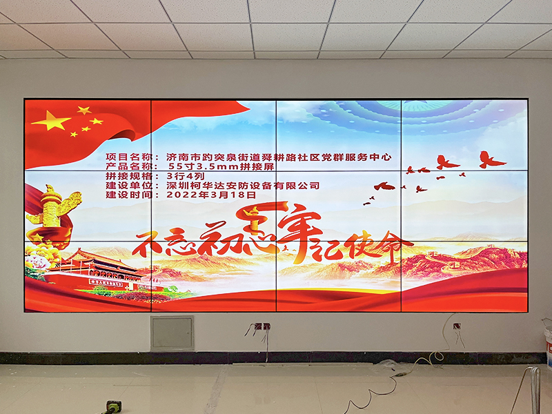 柯華達(dá)品牌力助舜耕路社區(qū)黨群服務(wù)中心,采購55寸液晶拼接屏3×*4,漢思解碼器,高清動(dòng)態(tài)畫質(zhì),多功能展廳、視頻會(huì)議、安防監(jiān)控、大數(shù)據(jù)中心,完美演繹智能化顯示終端。